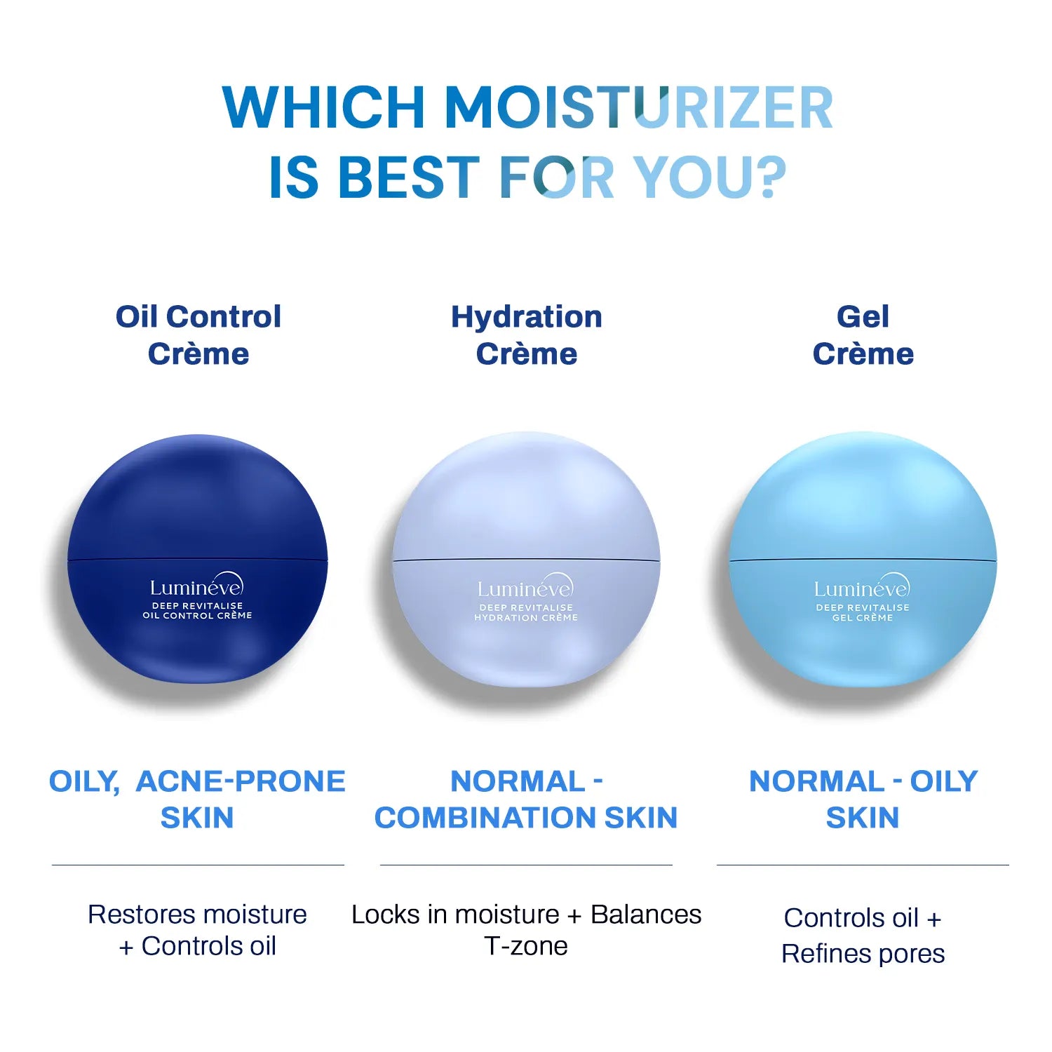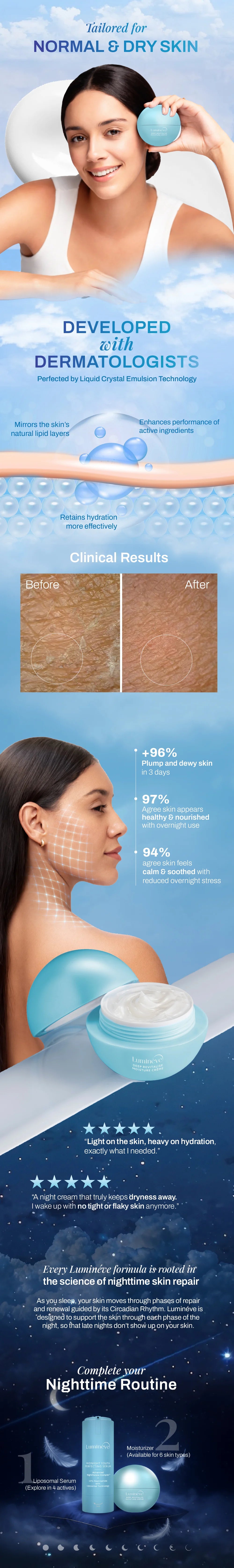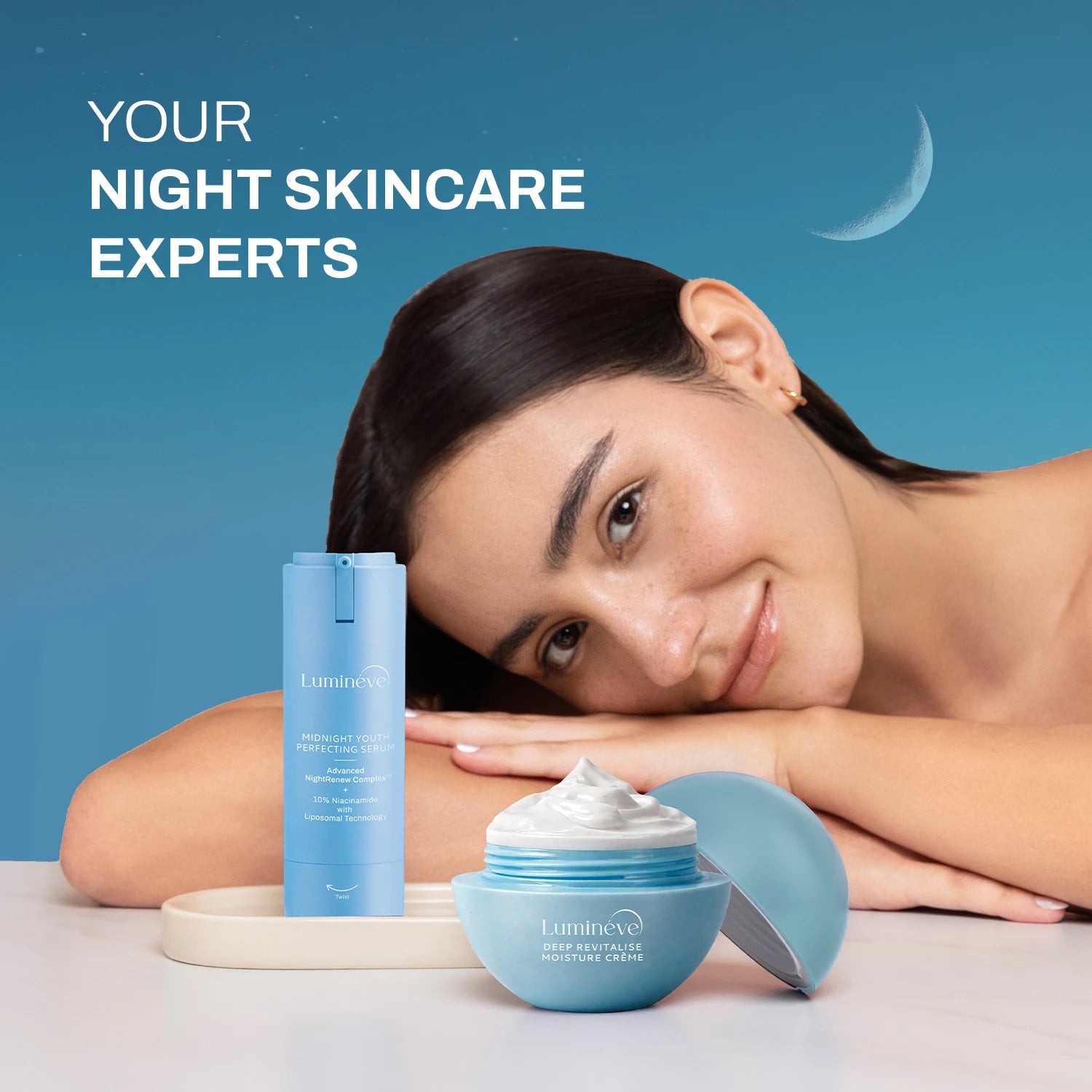 Powered by Advanced NightRenew Complex™, Lumineve Deep Revitalise Moisture Crème is specifically formulated for normal to dry skin. Enhanced with encapsulation technology, it works in harmony with your skin’s circadian rhythm to deeply hydrate, soothe the barrier and restore soft and supple skin by morning.