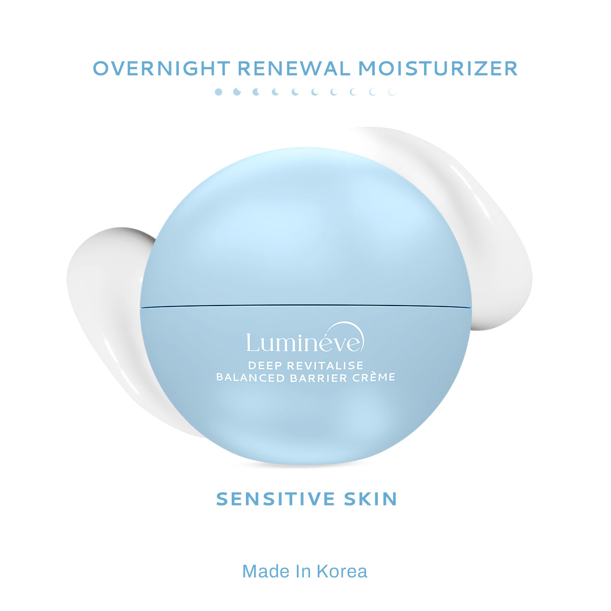 Lumineve Deep Revitalise Balanced Barrier Crème powered by dvanced NightRenew Complex™, is specially formulated for sensitive skin. Enhanced with encapsulation technology, it works in sync with your skin’s circadian rhythm to strengthen the barrier, boost moisture levels & soothe redness, leaving skin visibly hydrated, soft and supple by morning.
