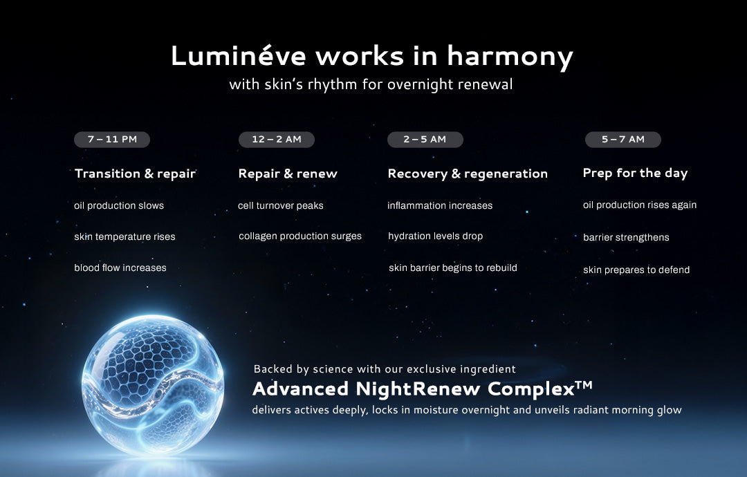 Experience nightly rejuvenation as your skin repairs while you sleep. Science-backed actives work with your circadian rhythm, replenishing moisture & restoring vitality, so you wake up to luminous skin