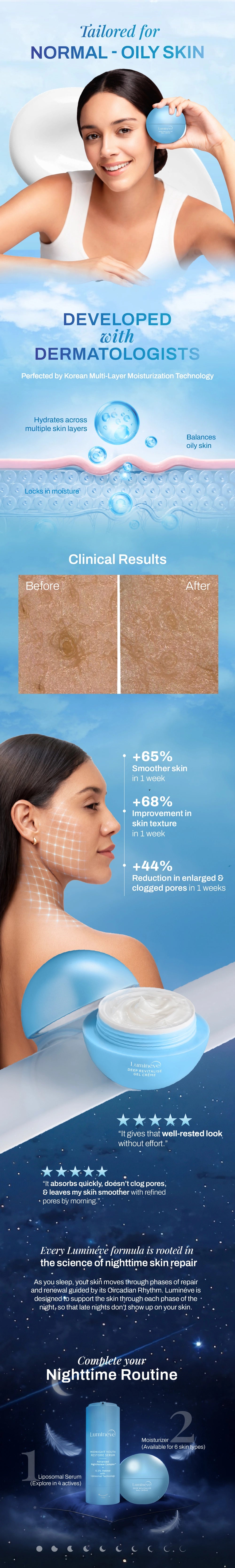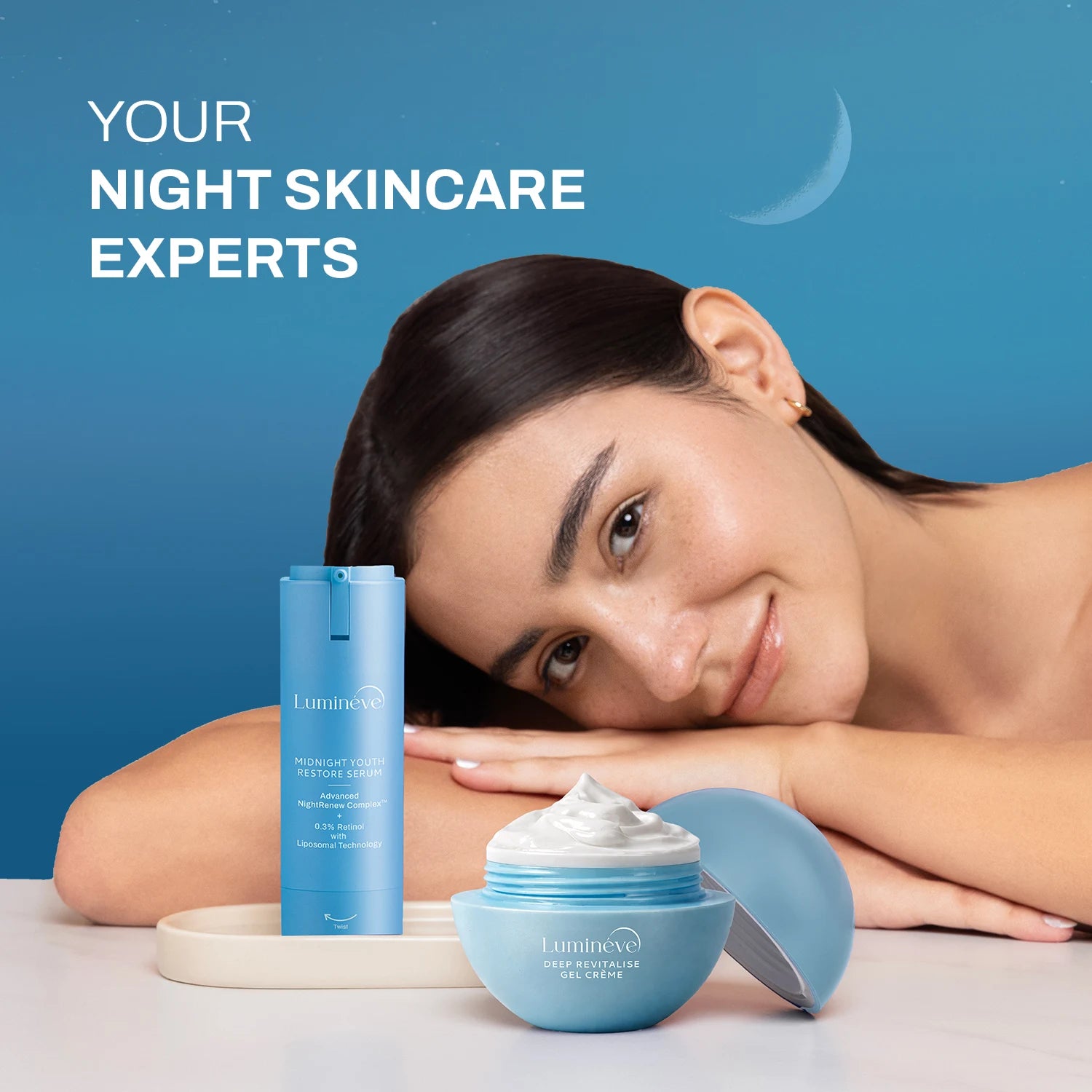 Powered by Advanced NightRenew Complex™, Lumineve Deep Revitalise Gel Crème rejuvenates normal to oily skin overnight. Enhanced with encapsulation technology, it works in sync with your skin’s circadian rhythm to restore balance, refine pores, control oil and lock in deep hydration, leaving skin visibly dewy & hydrated by morning.