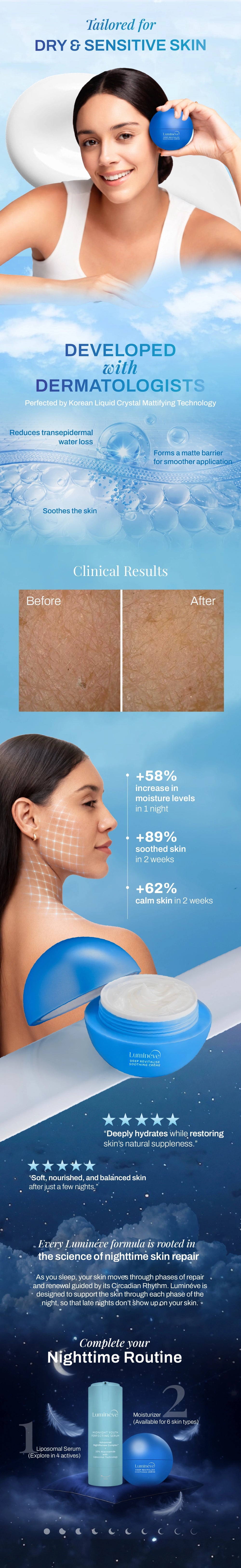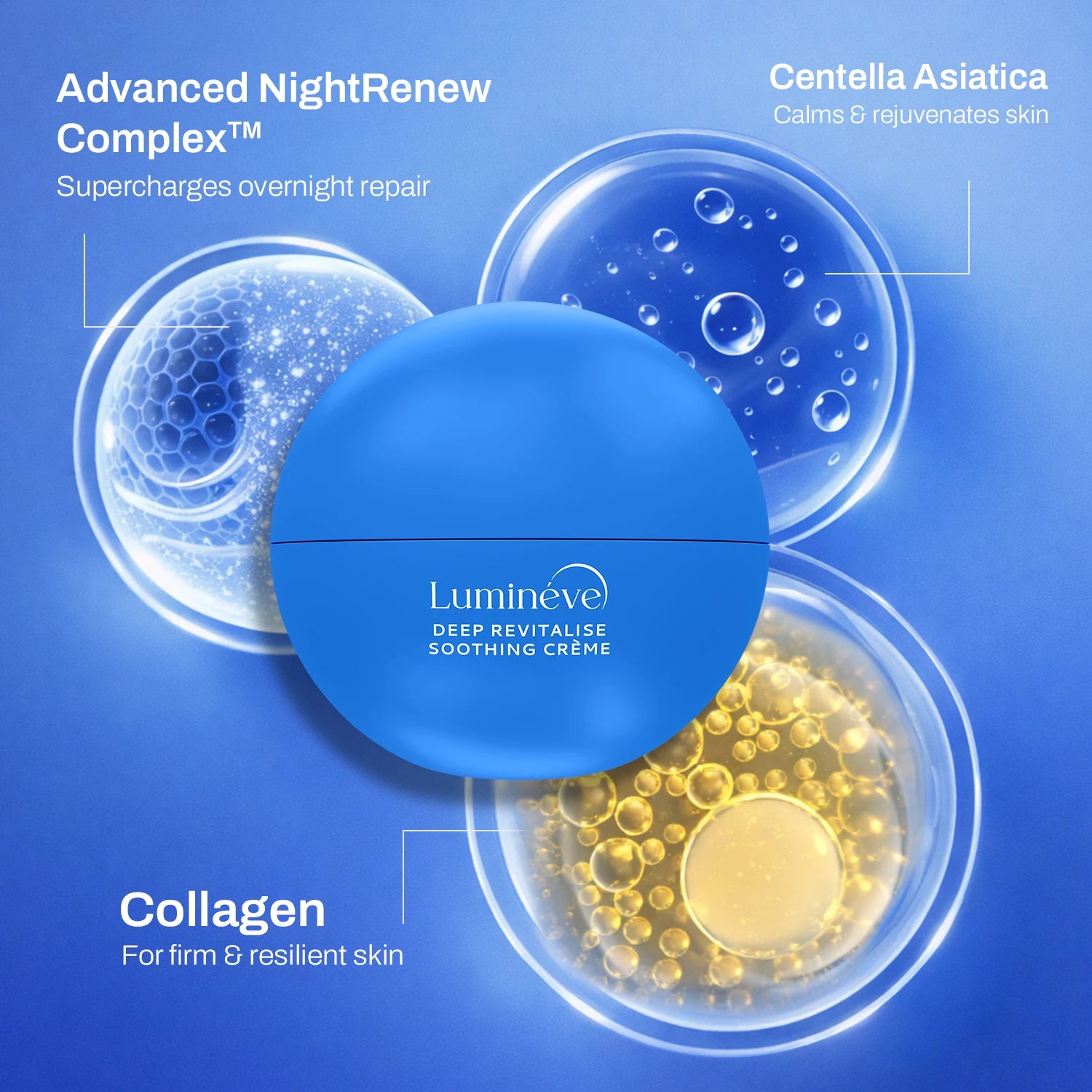 Powered by Advanced NightRenew Complex™, Luminéve’s Deep Revitalise Soothing Crème is specially formulated for dry and inflamed skin. Enhanced with encapsulation technology, it works in sync with your skin’s circadian rhythm to deliver intense hydration and barrier care, leaving skin soothed and dewy by morning.
