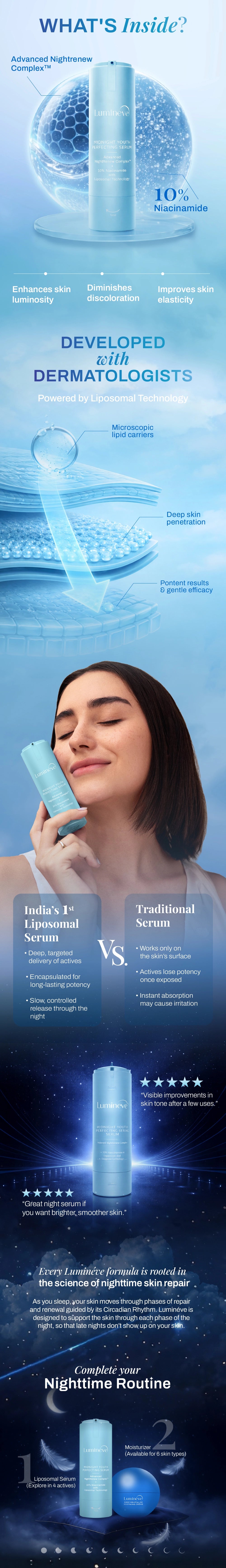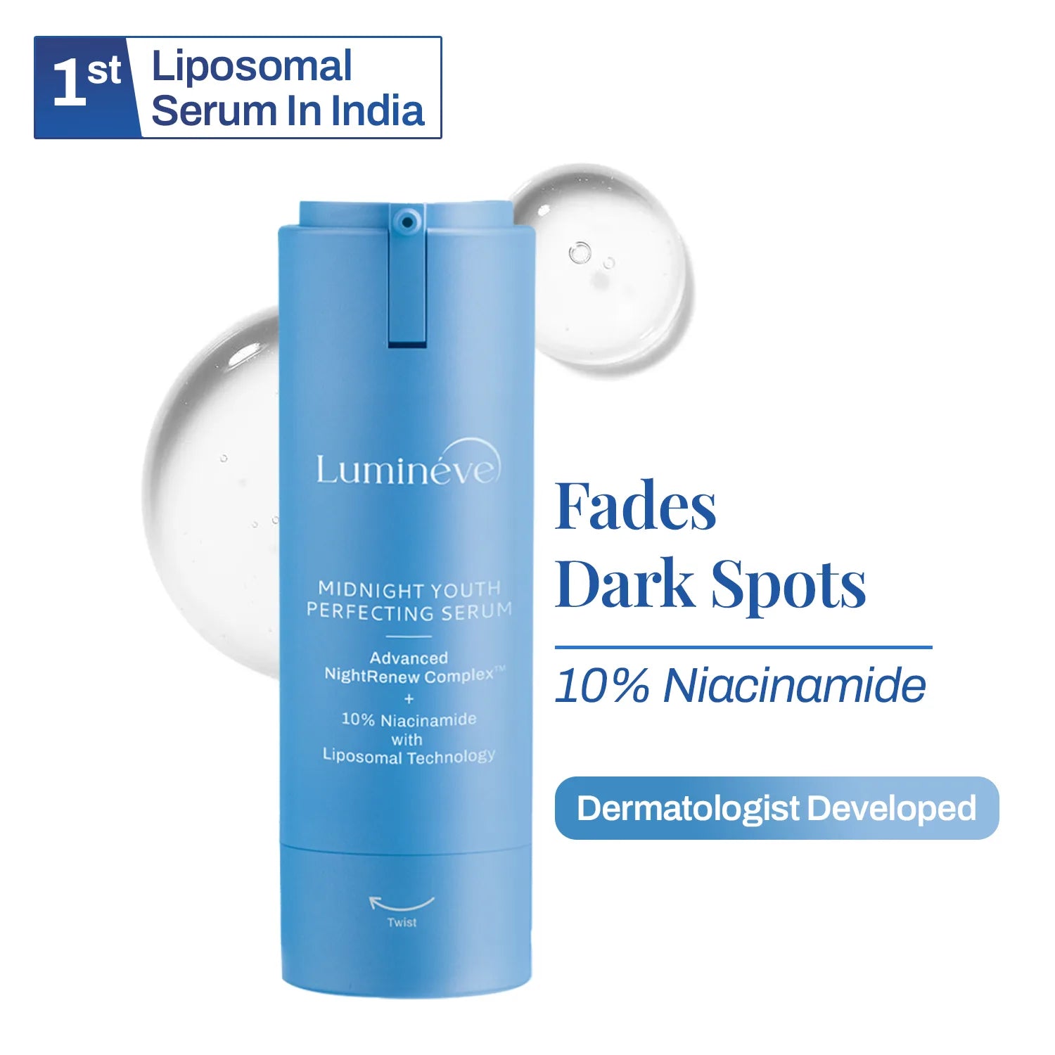 Powered with Advanced NightRenew Complex™ and Liposomal Niacinamide, Lumineve Midnight Youth Perfecting Serum penetrates into your skin deeply overnight to support its natural repair. This serum boosts elasticity, firms the skin & helps smooth uneven tone, while diminishing discoloration for a visibly clearer complexion.